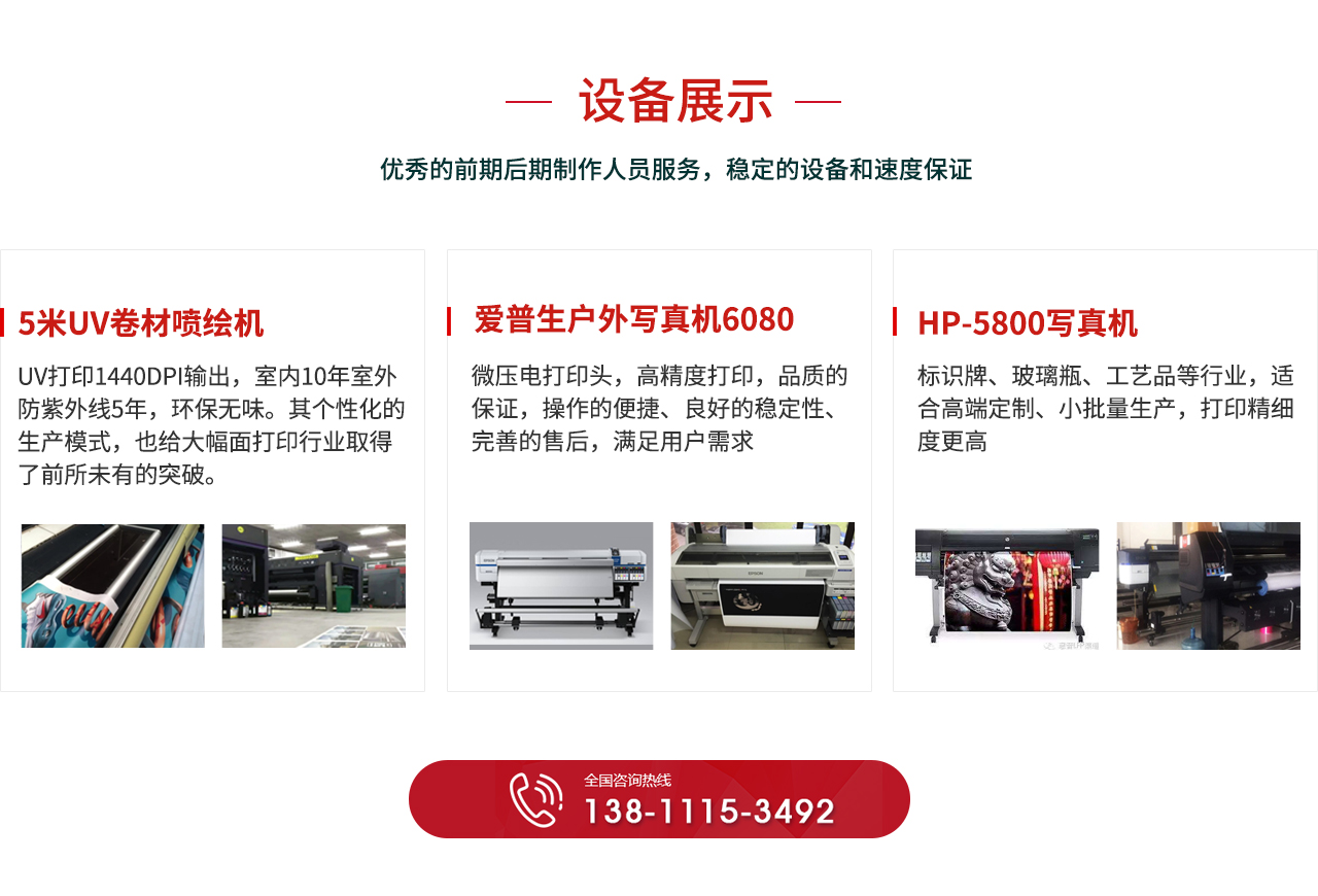 多臺5M3.2MUV打印設(shè)備,多臺愛普生HP打印設(shè)備,進(jìn)口后道設(shè)備,全套多臺快速加工能力大廠房為批量加工奠定基礎(chǔ)能力的能力,快效的項目執(zhí)行能力、優(yōu)異的團(tuán)隊協(xié)作能力